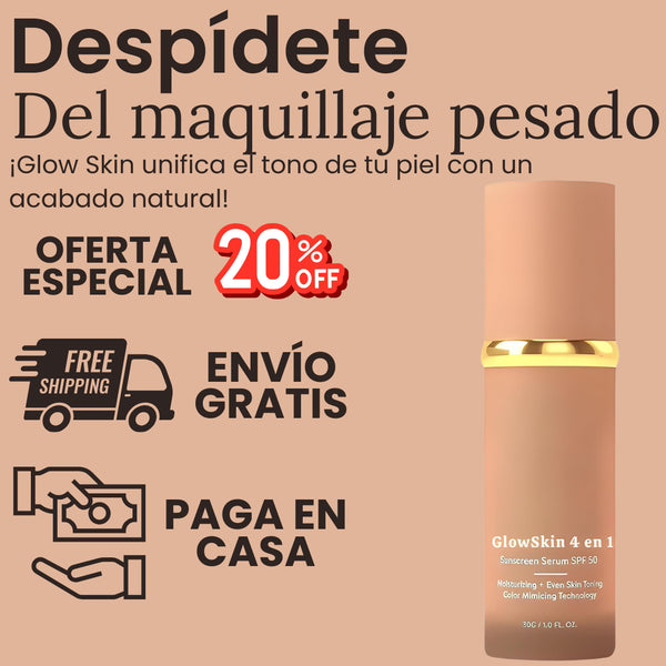 Haz tu pedido HOY y aprovecha el 20% de descuento por tiempo limitado. Recuerda: tienes Envío GRATIS y puedes pagar contra entrega. Dale a tu piel la protección y el acabado radiante que merece con GlowSkin™ 4 en 1.