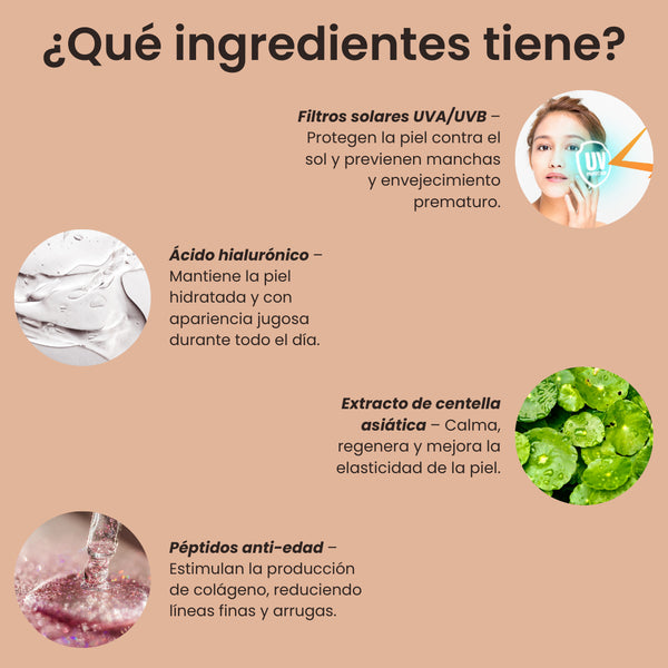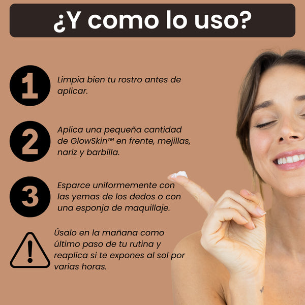 GlowSkin™ contiene filtros UVA/UVB que brindan una protección efectiva contra el sol en la rutina diaria. Para exposición prolongada o actividades al aire libre, se recomienda reaplicar cada 3 a 4 horas.