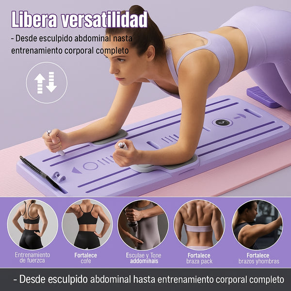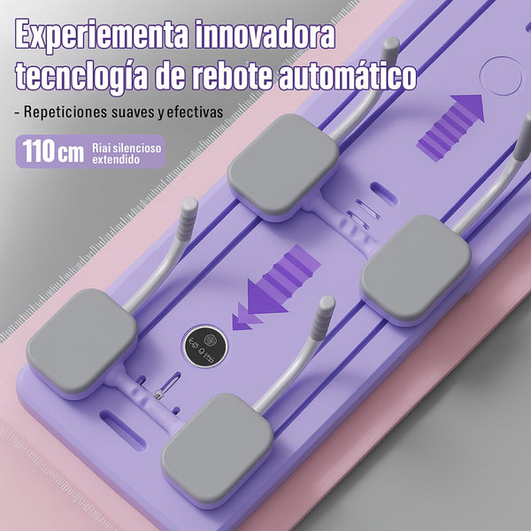 Ejercita brazos, piernas, abdomen, glúteos y espalda con una sola máquina. La tabla está diseñada para rutinas funcionales y de pilates, ayudando a esculpir tu cuerpo de forma armónica.
