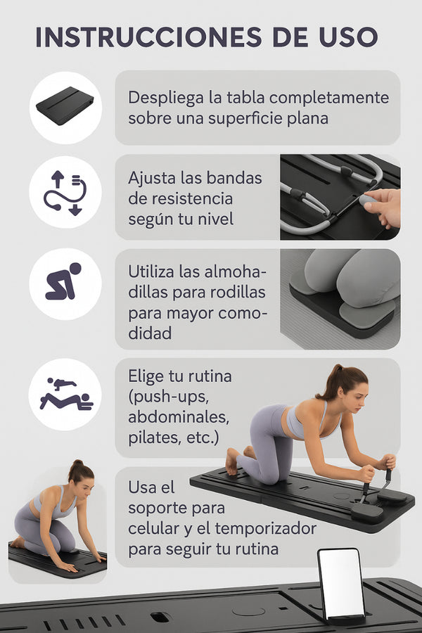 La PilatesTable es una solución todo-en-uno que integra pilates, tonificación muscular y entrenamiento funcional desde la comodidad de tu hogar.