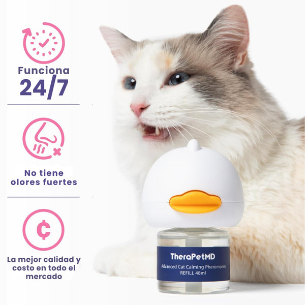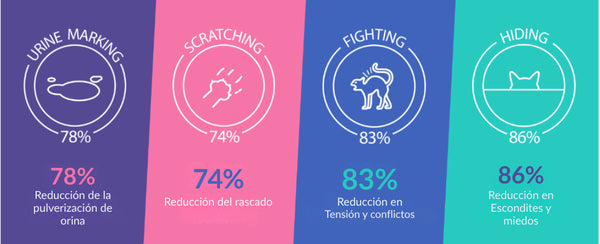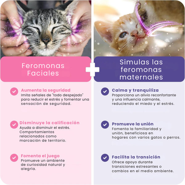 La mezcla dual de feromonas (faciales y maternal-appeasing) envía señales de seguridad que disuaden el marcaje por ansiedad y territorialidad. Menos orines en la casa significa menos limpieza y más tranquilidad.