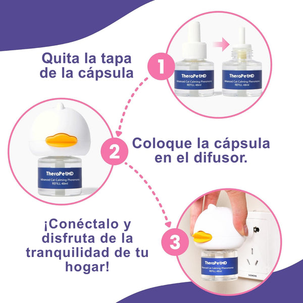 TheraPet actúa todo el día al estar enchufado: es una solución segura, sin medicación ni polvo, diseñada para crear un ambiente estable y calmado sin alterar la salud del animal.